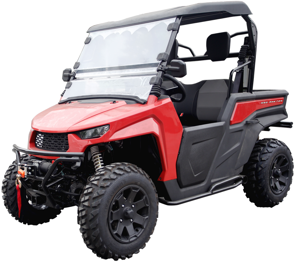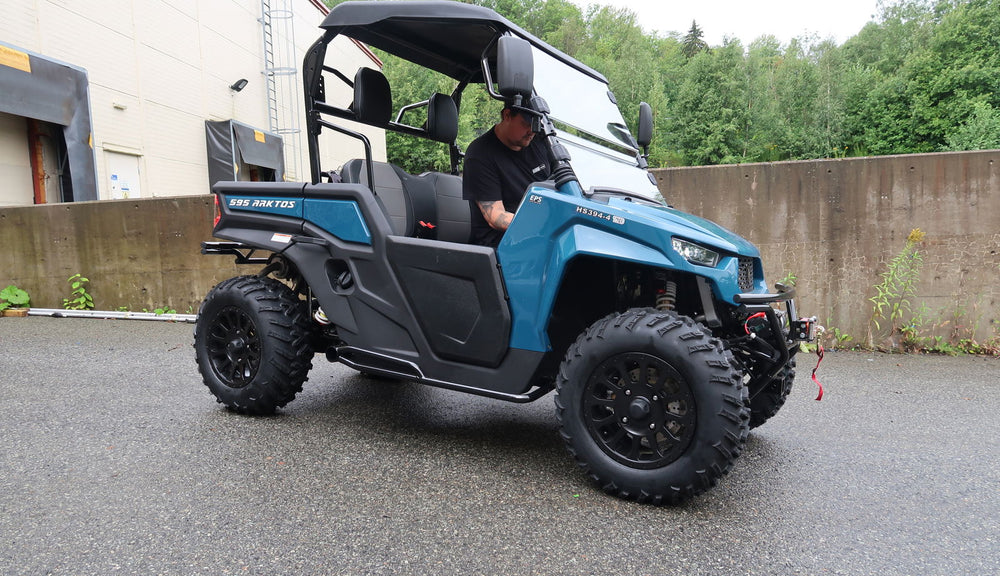 Tak og frontrute beskytter mot elementene. Lave sidedører gir enkel inn- og utstigning. Går turen over stokk og stein, har 595 Arktos gassdempere som gir mindre belastning på kroppen ved kjøring.