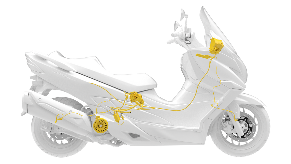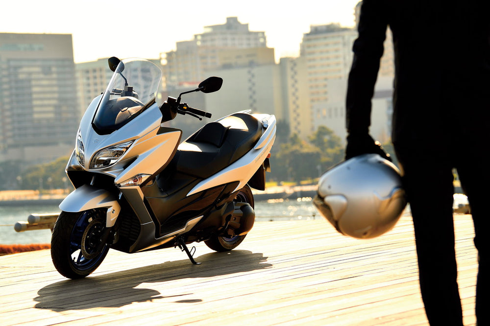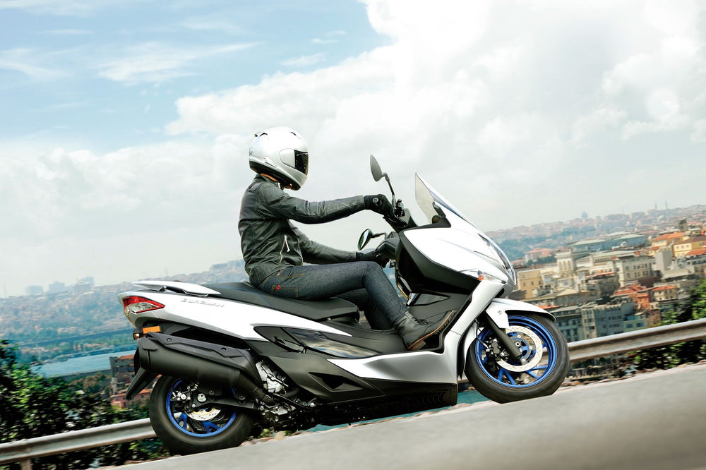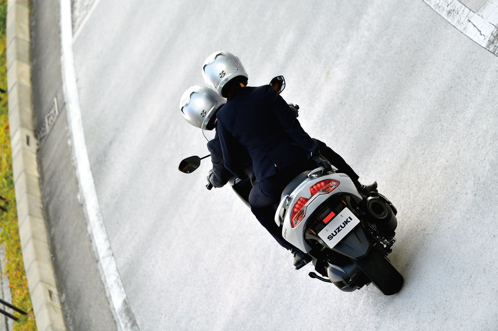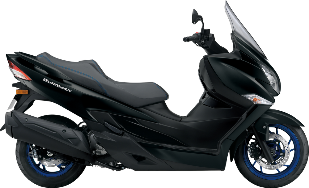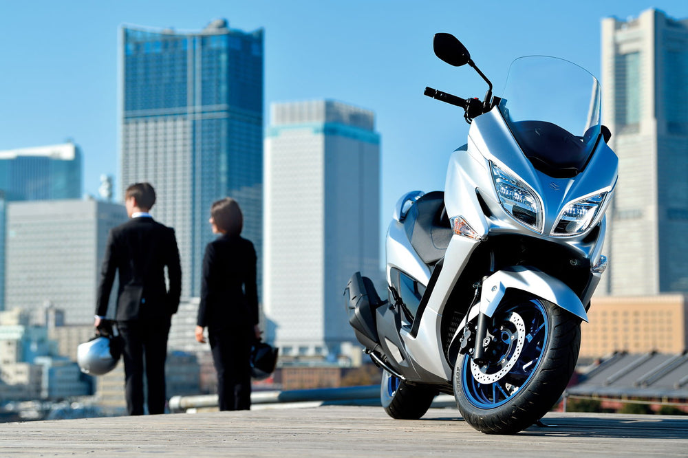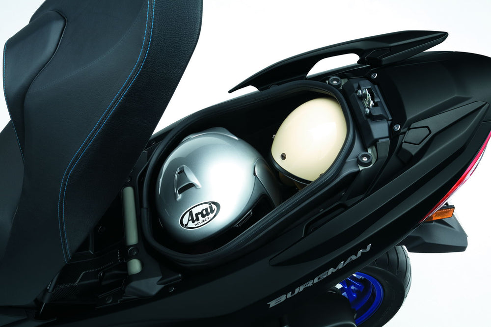 Med stort oppbevaringsrom under setet, ypperlig kjørekomfort, lave driftskostnader, smidige egenskaper og store mengder kjøreglede er Burgman 400 den perfekte følgesvennen til den urbane motorsyklisten som vil forflytte seg kjapt og effektivt inn og ut av byen. Nå kommer den med flere viktige oppgraderinger, med blant annet Traction Control, friskere design og mange motormessige forbedringer som gjør den enda sprekere. Det første du vil legge merke til på nye Burgman 400 er det mer funksjonelle designet – spesielt på instrumentene og displayet. Her vises alle parametere og funksjoner på en oversiktlig og elegant måte, slik at du kan konsentrere deg om kjøringen. Dette vil også hjelpe deg til å bli en mer effektiv og økonomisk fører. Den komfortable og oppreiste kjørestillingen bidrar sammen med den høye vindskjermen til optimal oversikt, og holder deg så å si tørr på våre dager. Det er krefter i overflod for den som liker å stramme wireren litt ekstra. Burgmans 400 kubikk store ensylindrede firetaker har fått flere vesentlige oppdateringer som gjør den enda sterkere. Ikke bare er den blitt bedre å kjøre: Den oppfyller også de strenge avgasskravene, samtidig som den byr på god drivstofføkonomi. Et ekte kinderegg der, altså! Vel vitende om at Burgman har både motorkraft, bremser, kjøreegenskaper og teknikk som på en vanlig motorsykkel, er det likevel den praktiske delen som ofte har størst betydning for brukerne. Scooter er definitivt et kjøretøy for de trafikktette byene, og da er det de praktiske kvalitetene som avgjør. Her scorer Burgman 400 helt i toppen. Maksimal komfort og praktisk funksjonalitet på høyeste nivå er viktige elementer. Burgman 400 har fått et Traction Control-system som vi kjenner fra V-Strom 650 og GSX-S750. Her kan føreren velge den innstillingen som gir trygghet og utmerket veigrep under alle forhold. Suzukis Easy Start System er nå en standard Burgman-funksjon. Et enkelt trykk på startknappen starter motoren, mens det oppdaterte drivstoffinnsprøytingssystemet opprettholder en jevn tomgang under alle forhold. Et slank design gjør den smidig i tett bytrafikk. Det komfortable doble setet kombinerer en 78,5 mm tykk pute med slank design, for å gi luksuriøs komfort for både fører og passasjer. Selv med slank og kompakt design bak, er det fortsatt god lagringsplass under setet. 42 liter plass gir mulighet for oppbevaring av hjelm når du ikke ønsker at den skal bli stjålet. Eller du kan ha med deg arbeidstøy, PC, skolesekk, treningsbag eller hva annet du trenger med deg i byen. Foran finner du to rom på 2,8 og 3,5 liter, samt 12 V-uttak for mobillading. Suzuki har prioritert sikkerhet på nye Burgman 400. På samme side som tenningsnøkkelen, finnes den lettbetjente P-bremsen som virker på bakbremsen når den parkeres. Det kan være nyttig når du parkerer i en skråning. Suzuki Advanced Immobilizer System (SAIS) bruker et elektronisk identifikasjonssystem i eierens nøkkel for å hindre uautoriserte personer i å starte motoren. Et magnetisk deksel som kun kan åpnes med eierens nøkkel beskytter tenningsbryteren for ekstra sikkerhet. En kjedelåsport lar deg føre en kjedelås/kjetting gjennom karosseriet, rundt rammen og deretter rundt en stang eller annen fast gjenstand.