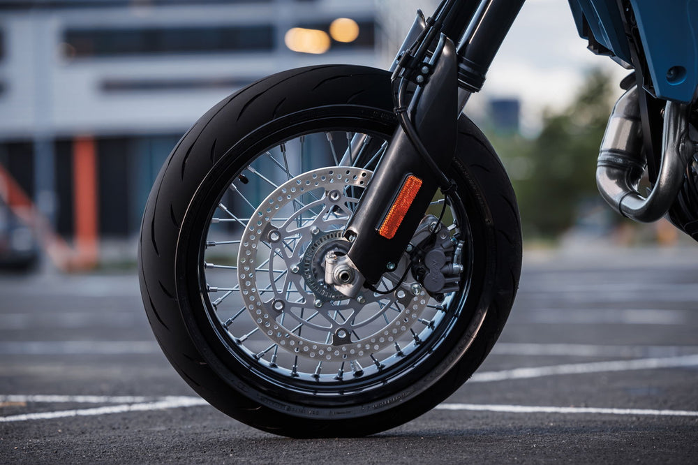For å maksimere ytelsespotensialet på vei og supermotobane, har DR-Z4SM 17-tommers felger foran og bak.