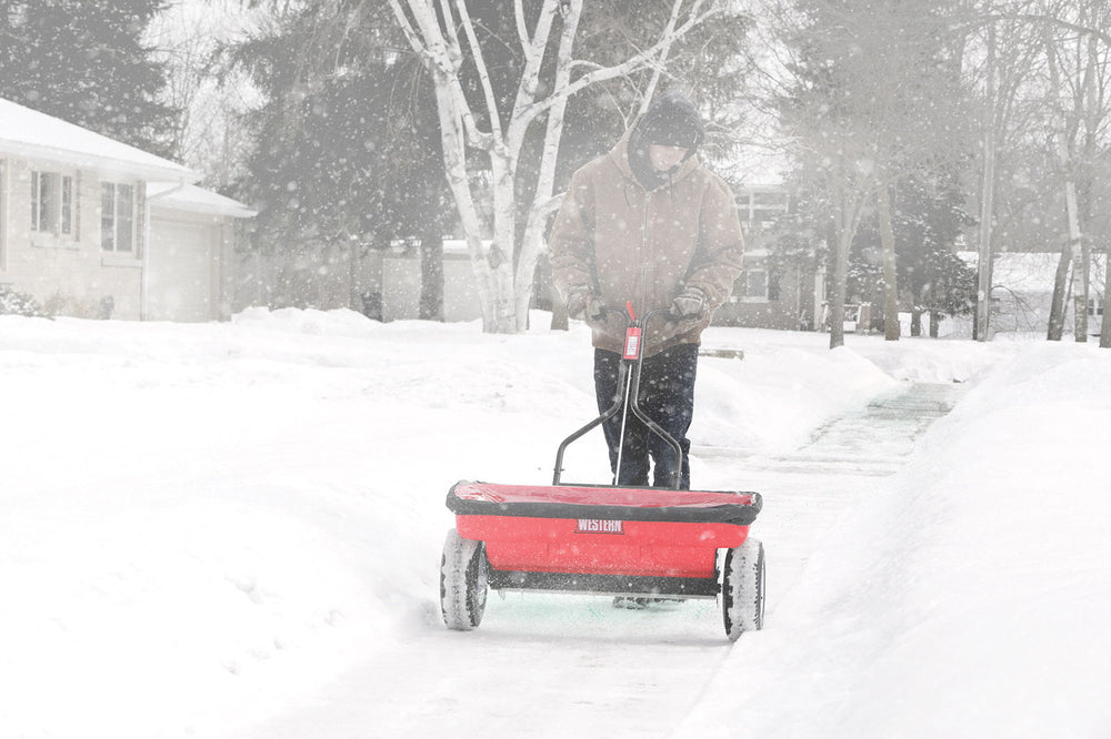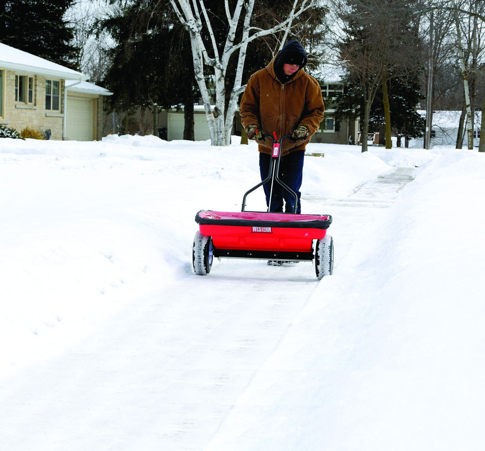 Western® sin manuelle spreder er konstruert av robust, korrosjonsfri polyetylen. Denne håndtere de fleste is-smeltematerialer. Sprederen kommer standard med et gjennomsiktig trekk som holder trauet tørt og du kan enkelt se hvor mye som er igjen i trauet. WB-160D-strøeren slipper materiale direkte ned på den roterende akselen gjennom en justerbar åpning på 91 cm. Varenr. WE85201